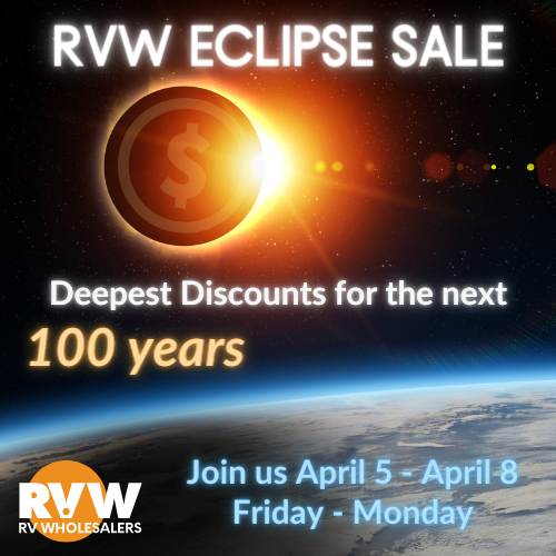 From Friday Apr 5 - Monday Apr 8, RV Wholesalers will be showing 200+ stock units at our lowest price ever. There will not be a sale with prices this low until the next total eclipse in Ohio (2099)! Units will be sold thousands below factory invoice, so don't miss out on this opportunity.